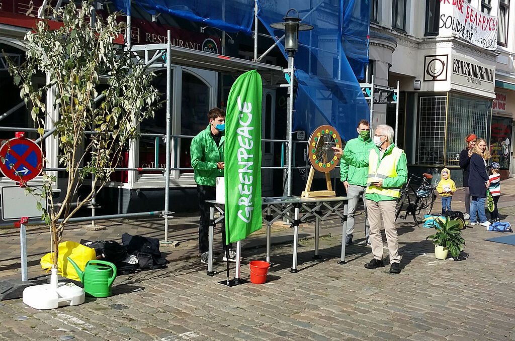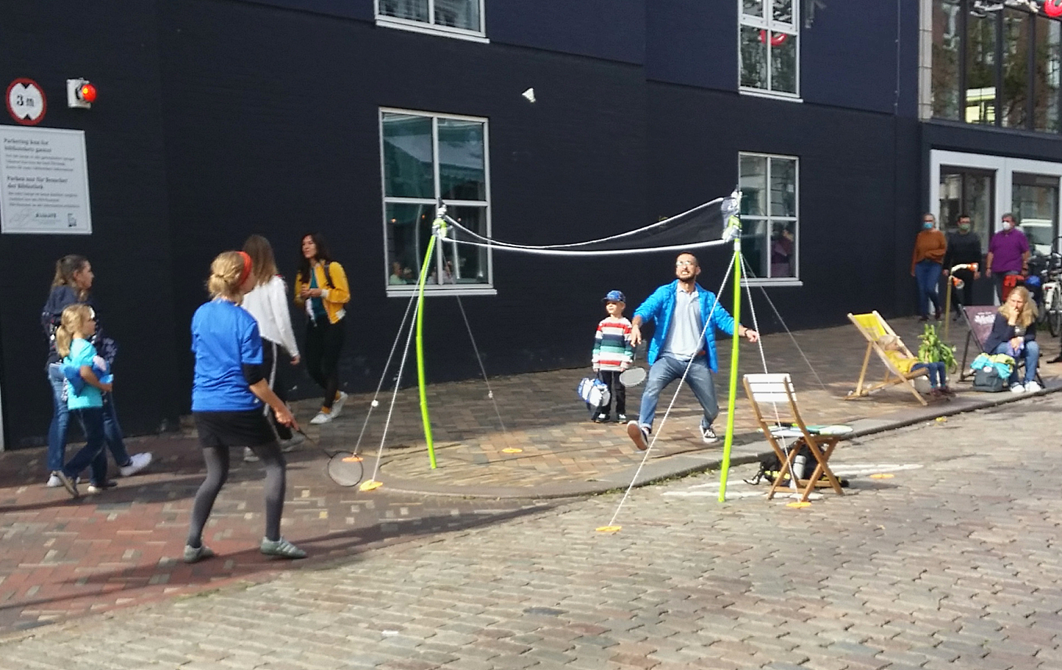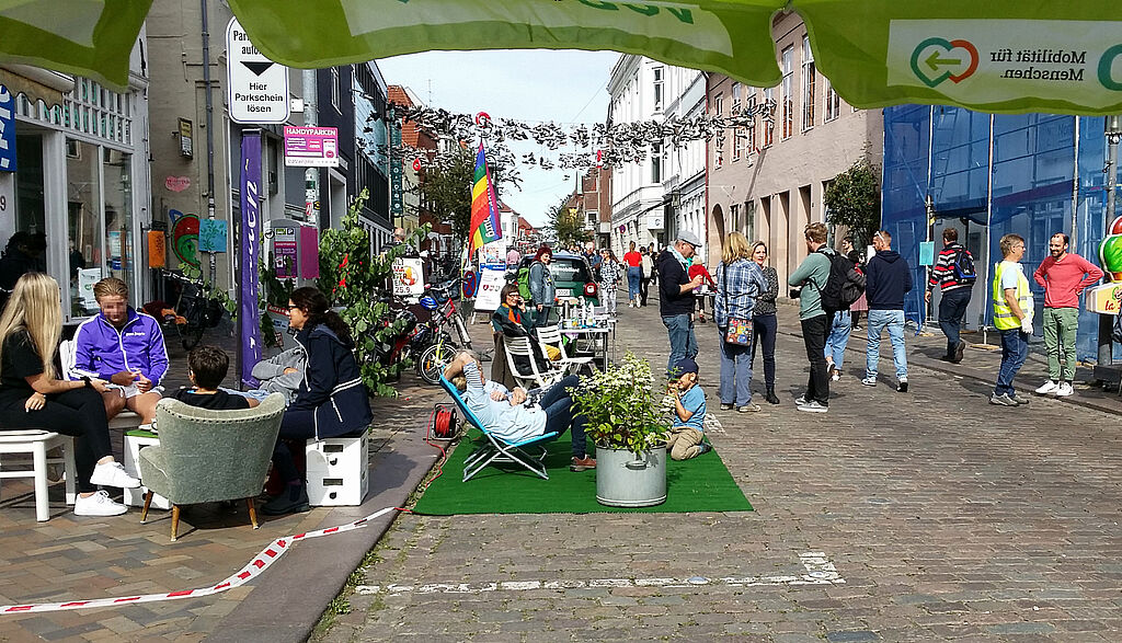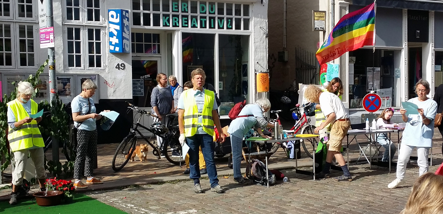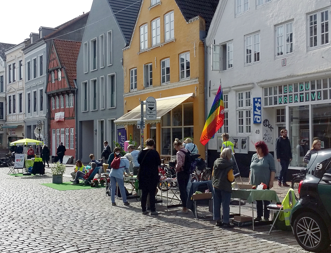 Die Bandbreite reichte von der Aktion Seebrücke, Greenpeace und VCD und dem neuen Netzwerk FliB (Flensburg in Bewegung) über eine Stadtoase mit Vogelgezwitscher, den Federball-Court, verschiedene Sitzrunden bis zu den anliegenden Cafes, die gerne Tische und Stühle herausstellten.