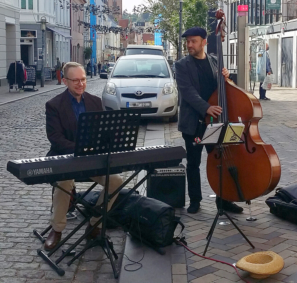 Freunde, Bekannte und Gäste von auswärts schlenderten entlang, begleitet von Klängen des Jazzduos Robbers & Strothmann, die vor Isas Cafe mit Klavier und Kontrabass aufspielten. "Es war eine Freude, hier bei Sonnenschein zu musizieren, ganz besonders in diesem Jahr voller Einschränkungen", so Jens Robbers. Autofahrer zeigten Verständnis und konnten problemlos passieren.
