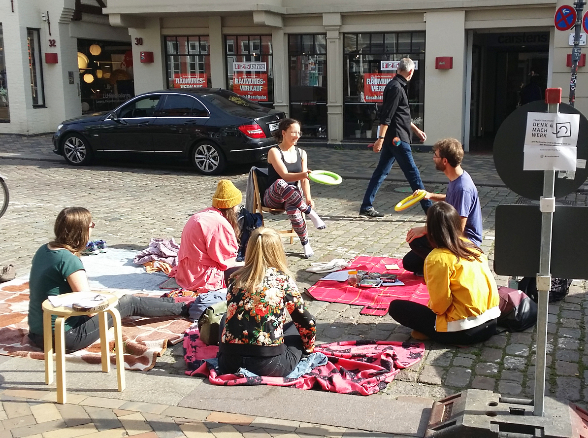 Die Ortsgruppen von ADFC und VCD und die Aktionsgruppe KLIMA Flensburg hatten eingeladen - und die Teilnehmer:innen kamen, mit Klappstühlen, Teppichen, Zimmerpflanzen und Springbrunnen. Am Samstag, 19. September 2020, genossen Anwohnende, Passant:innen sowie Flensburger Initiativen und Gruppen den Parking Day in der Norderstraße. Von 11:00-14:00 Uhr widmeten sie jeweils einen Parkplatz um und gestalteten die 12 Quadratmeter nach Wunsch.