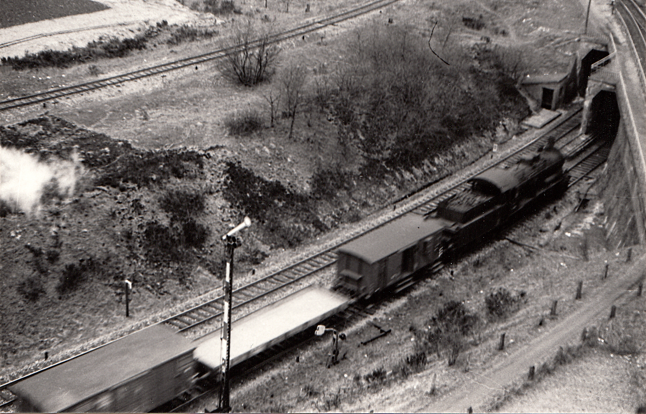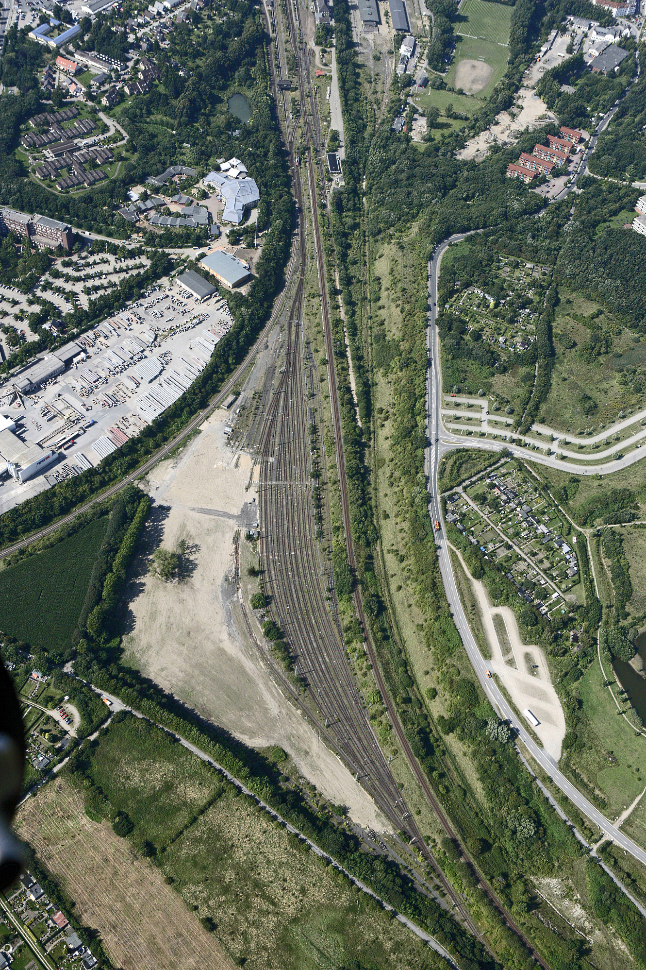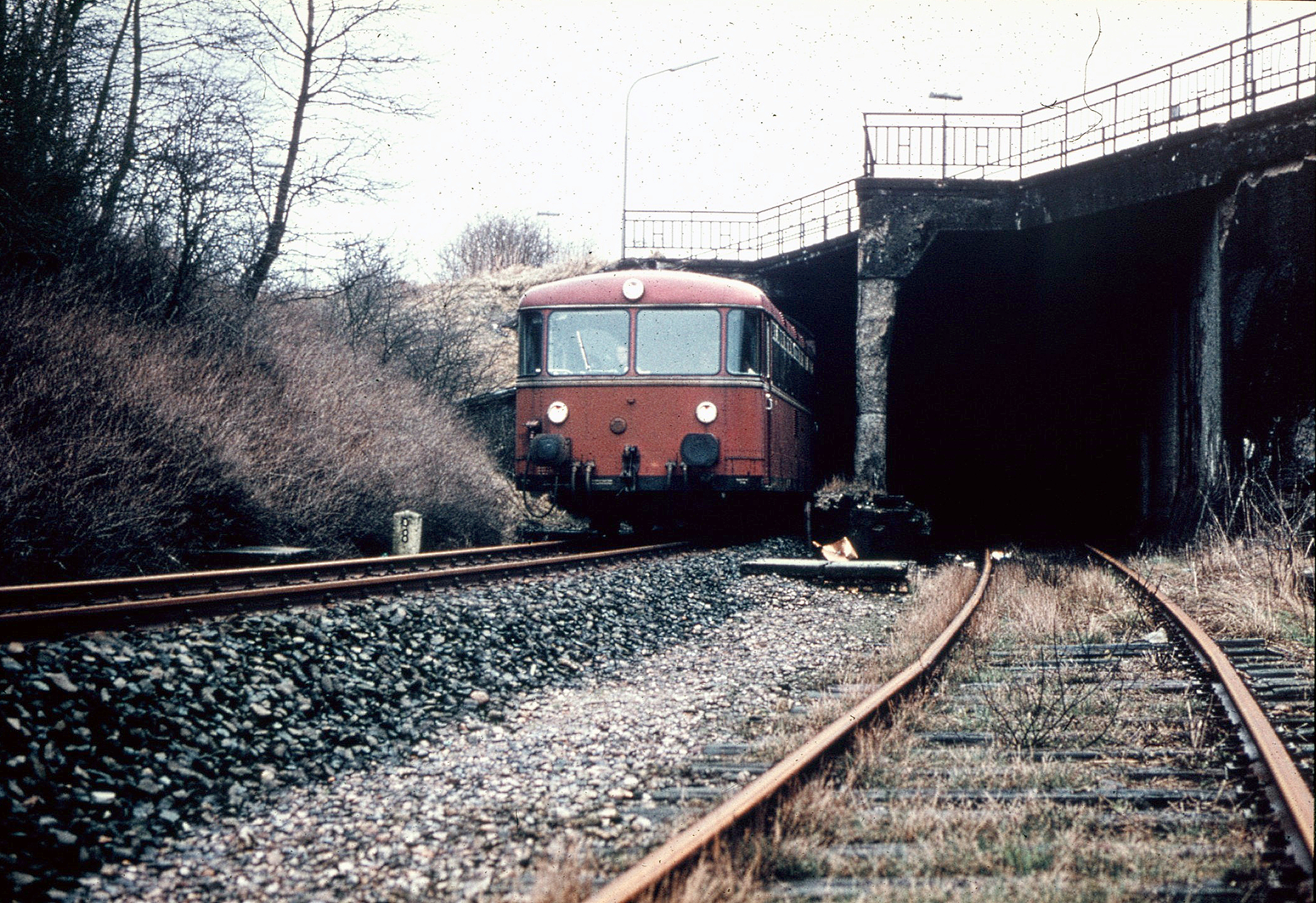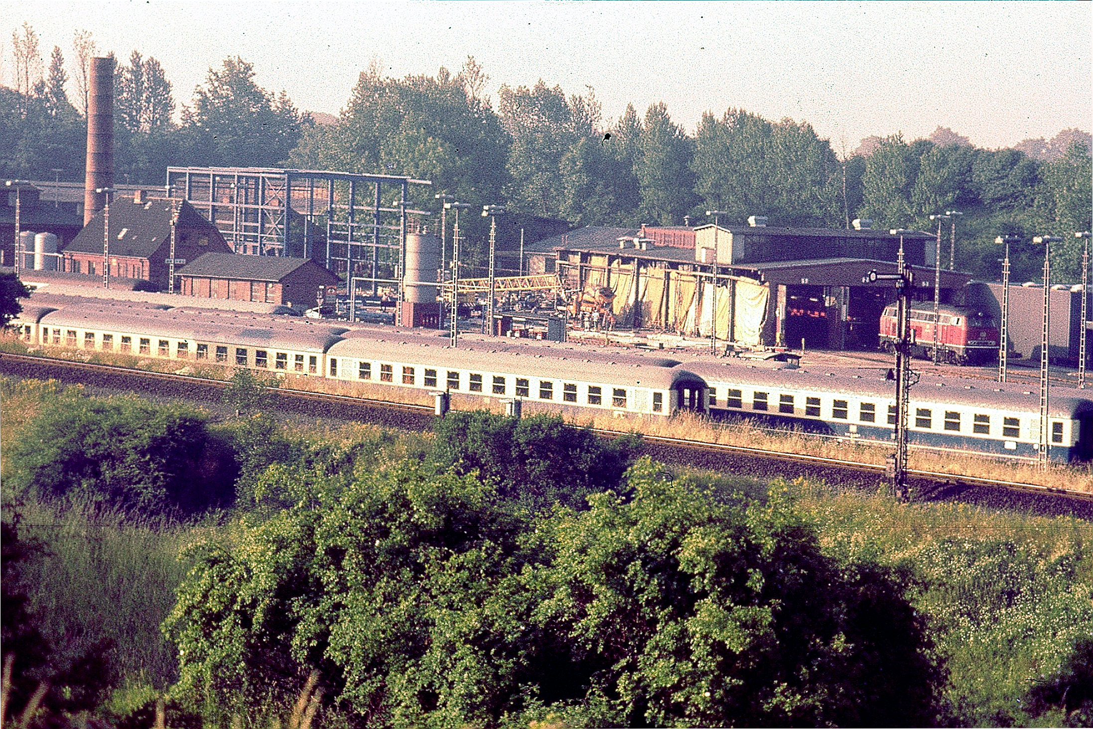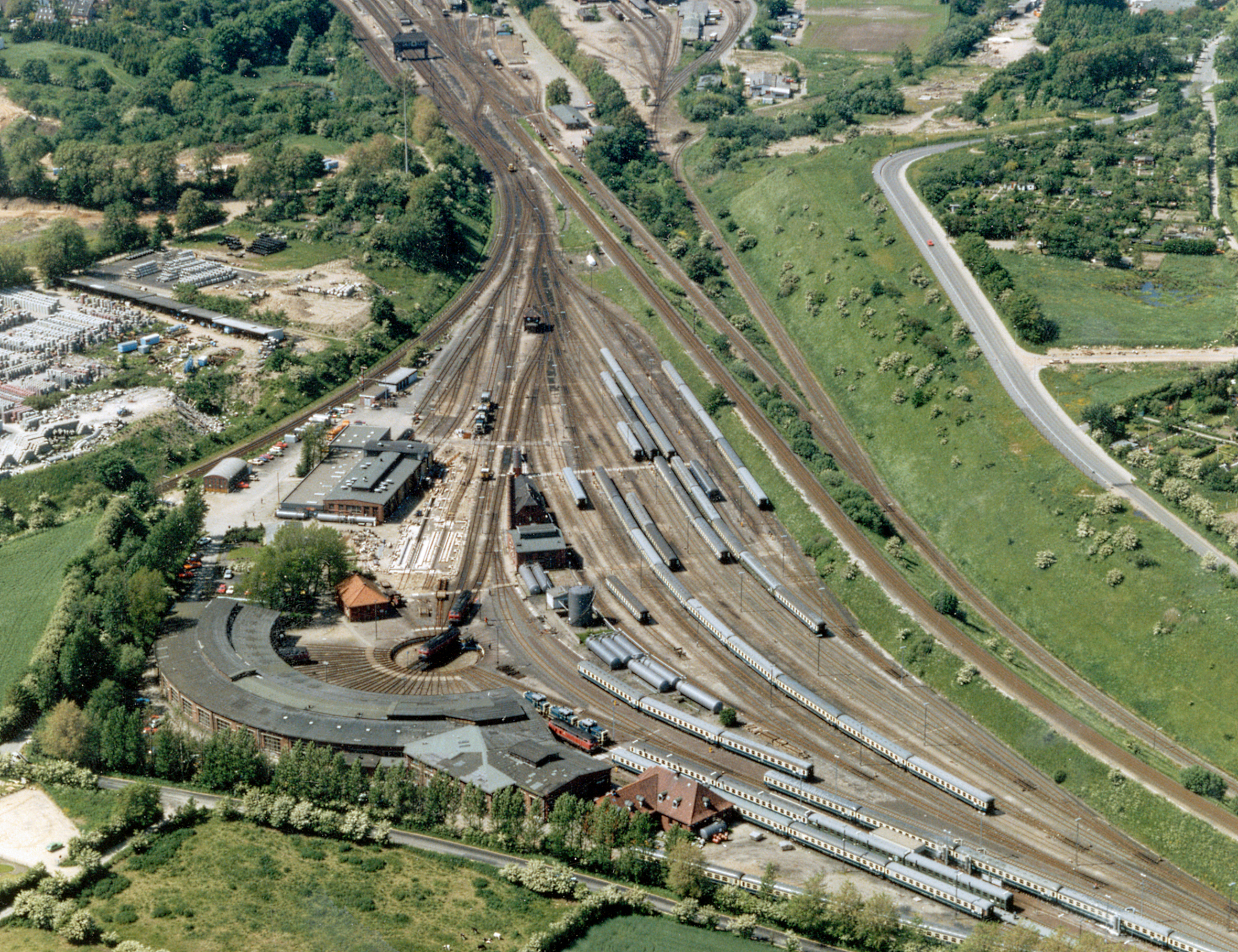 Ein Sonderzug im Jahr 1993, gezogen von einer Dampflok der Baureihe 01.10, fährt die Steigung hinauf nach Weiche. Der Zug brachte Technikfans aus dem Raum Hamburg zum Dampf Rundum nach Flensburg und wieder zurück. Das Gleis ganz links verband den Bahnhof Weiche mit den Bahnanlagen am ZOB.