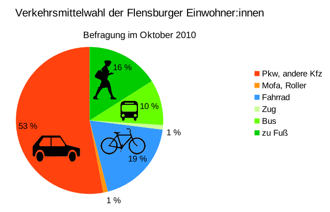 Die letzten offiziellen Ergebnisse, die vorliegen, stammen von der Mobilitätsbefragung im Oktober 2010. Damals wurden 15.000 Haushalte aus allen Stadtteilen und Altersgruppen in Flensburg angeschrieben und um Antwort gebeten. Gut 20 Prozent, also jede fünfte Person, nahmen teil.