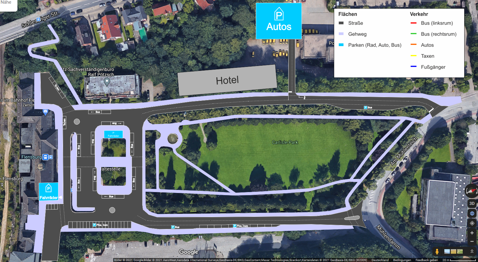 Die Firma SBI, Beratende Ingenieure für Bau-Verkehr-Vermessung GmbH, Hamburg, hat im Auftrag der Stadt Flensburg ein Konzept zur Neuordnung des Verkehrs auf dem Bahnhofsvorplatz erstellt.