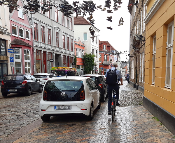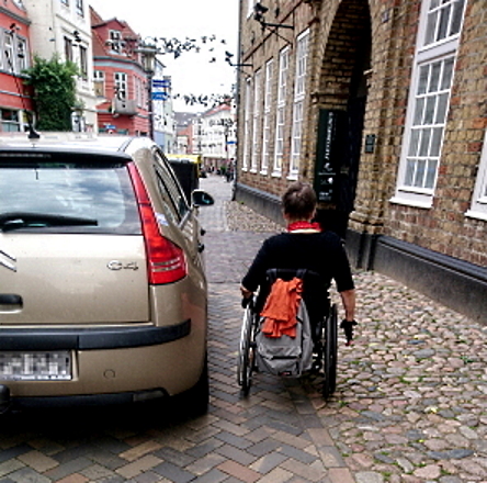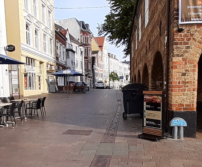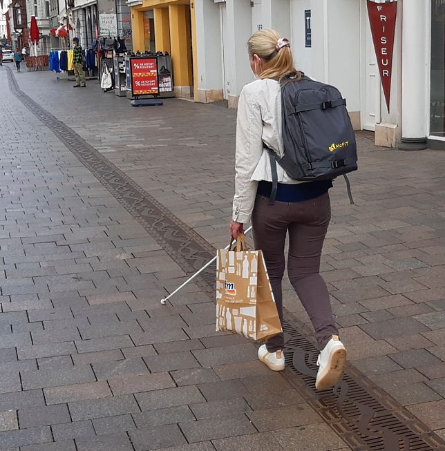 Die Blindenleitlinie, die durch die gesamte Fußgängerzone führt, ist eine großartige Errungenschaft in Flensburg. Doch Fakt ist: Viele kennen die Bedeutung nicht und halten die Leitlinie für eine Verzierung. Deshalb findet man immer wieder an oder auf der Leitlinie abgestellte Werbeaufsteller, Restaurantmöbel und anderes.