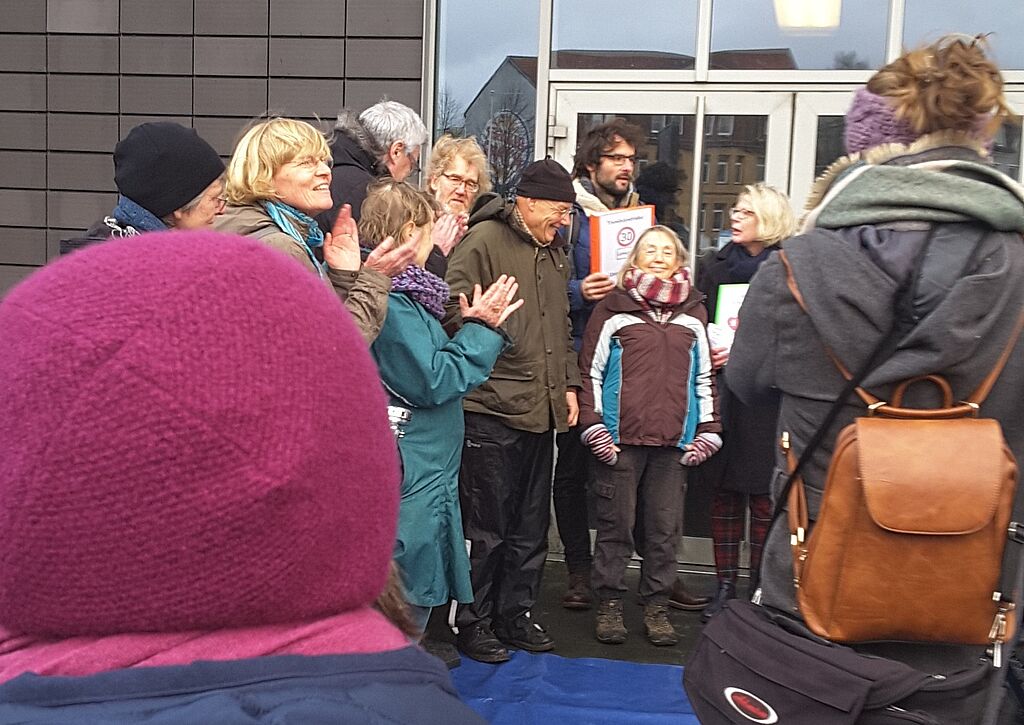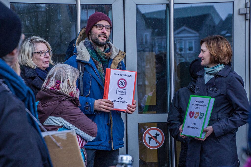 Am Montag, den 10. Februar fand die Übergabe der über 1350 Unterschriften statt, die die Ortsgruppen von VCD und ADFC und die Aktionsgruppe KLIMA Flensburg in den letzten Monaten gesammelt hatten. Angeschlossen hatte sich auch die Initiative "Tempo 30 in der Toosbüystraße" mit weiteren 400 Unterschriften.