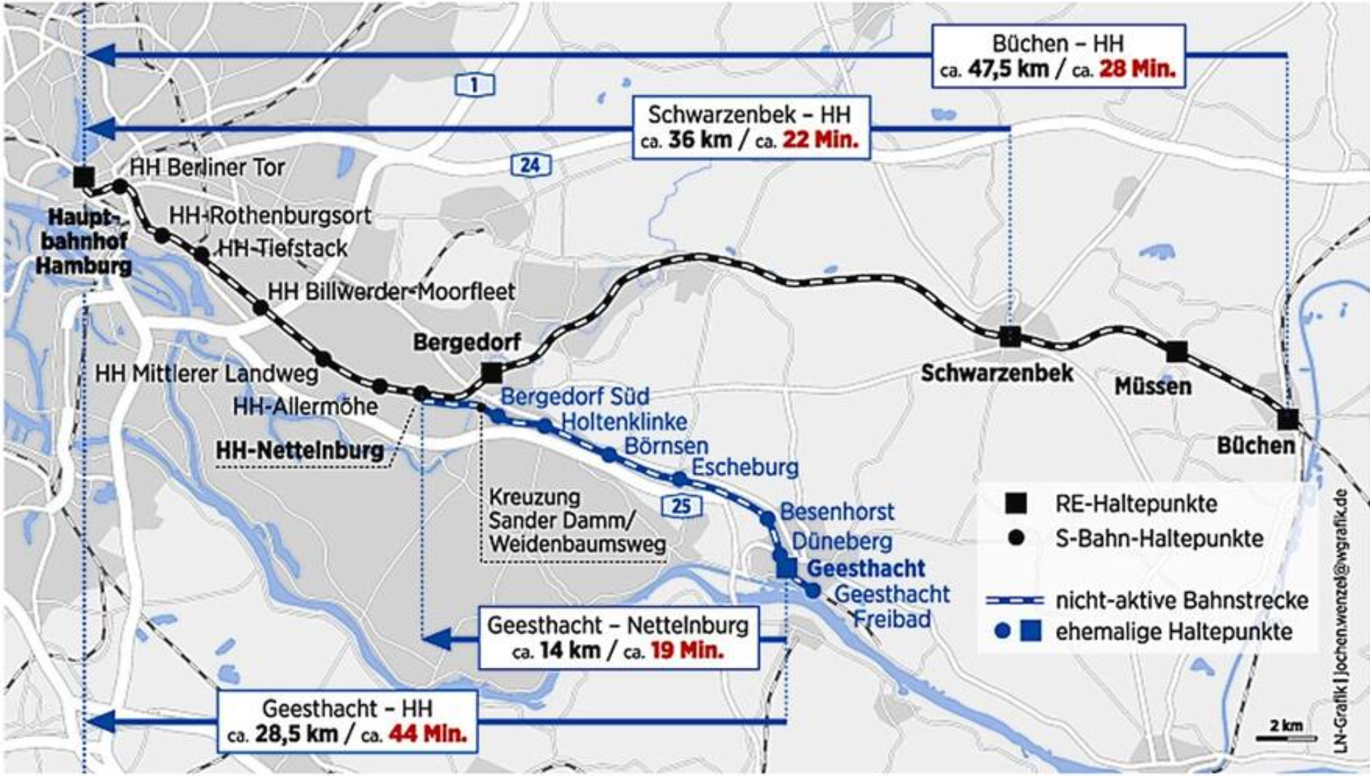Laut Gutachten ist die Reaktivierung unabhängig in zwei Schritten möglich, ohne, dass zusätzliche Kosten enstehen: Im ersten Schritt Geesthacht-Bergedorf und im zweiten Schritt die Durchbindung von Geesthacht zum Hamburger Hauptbahnhof.