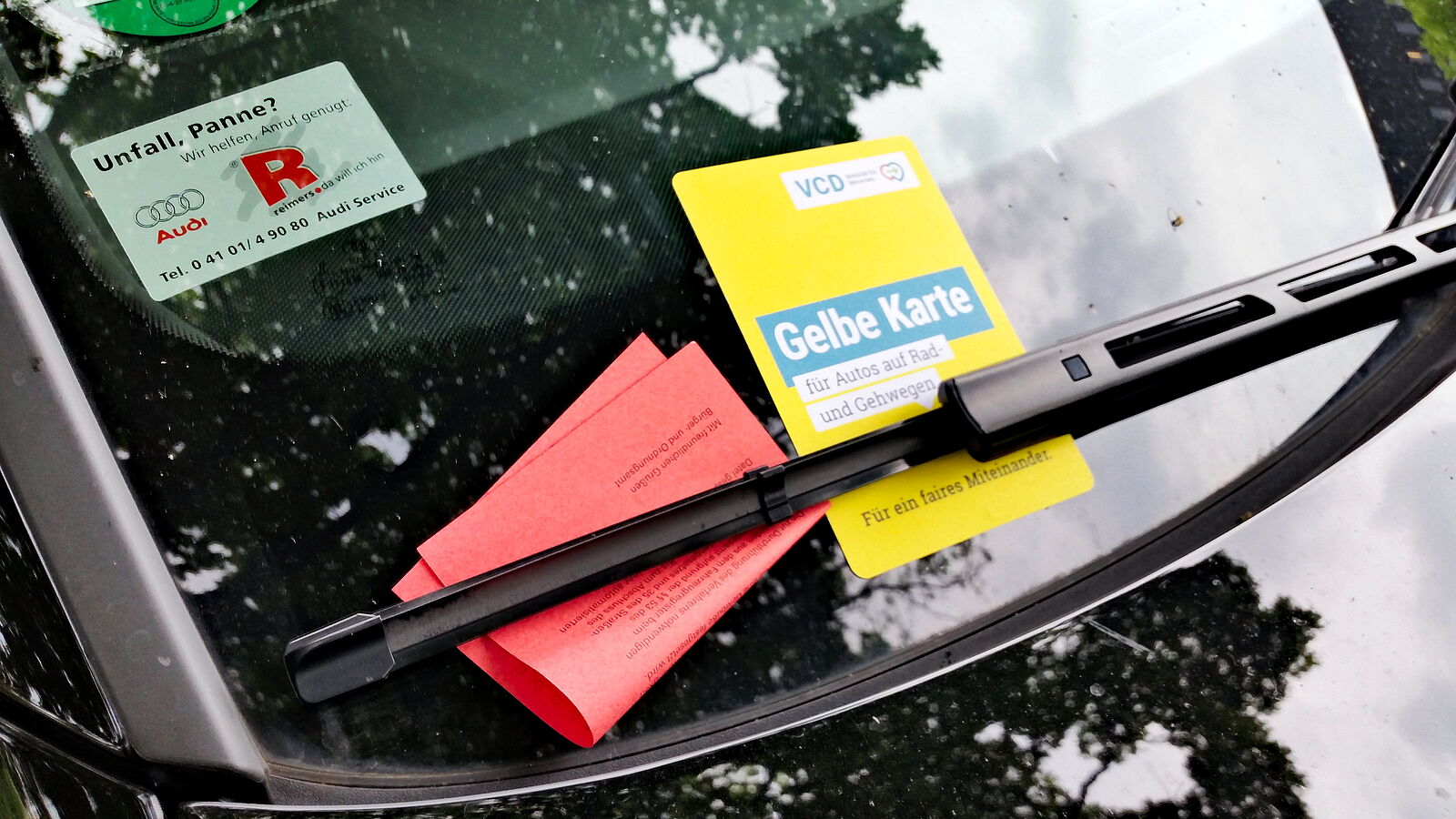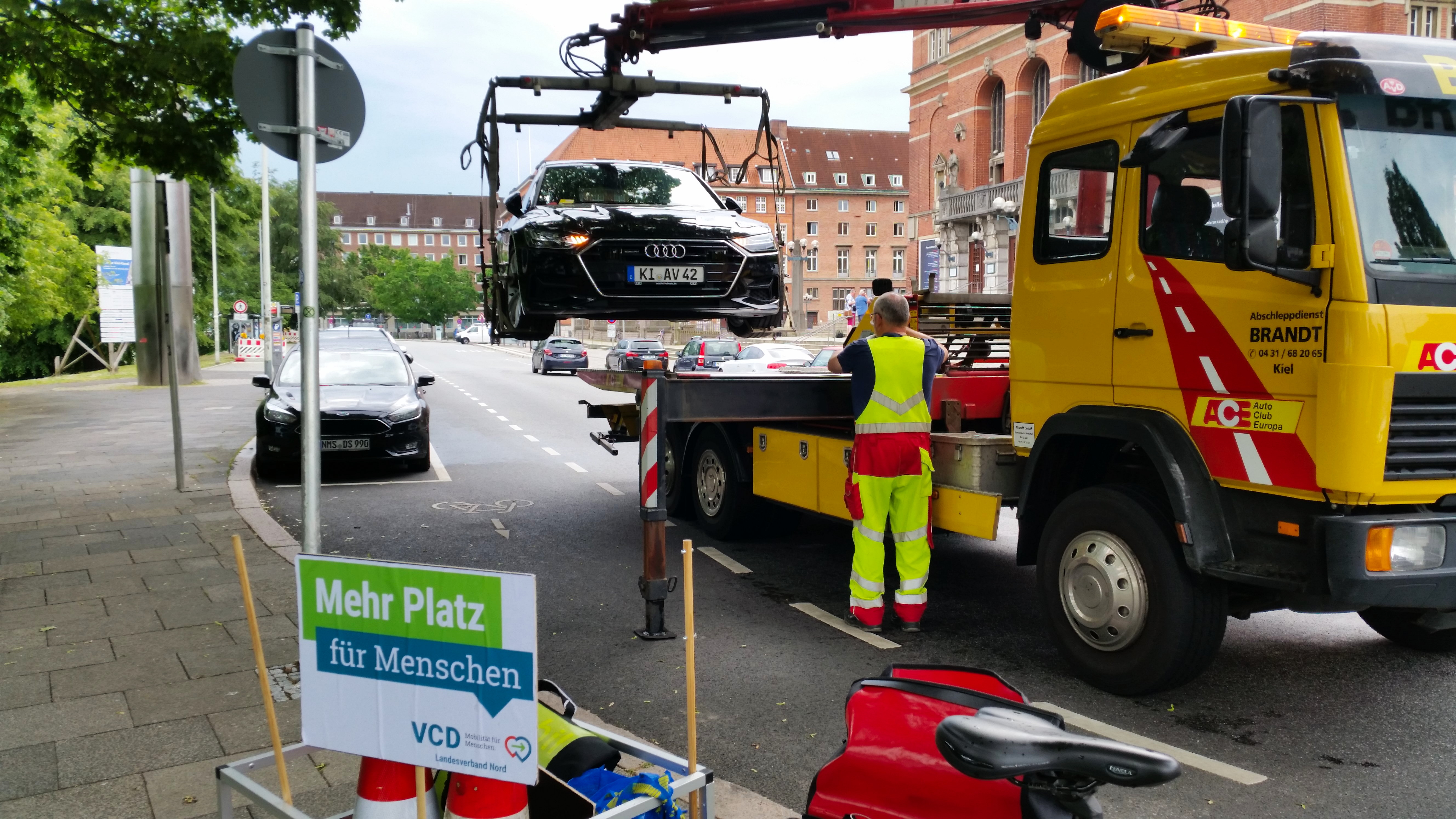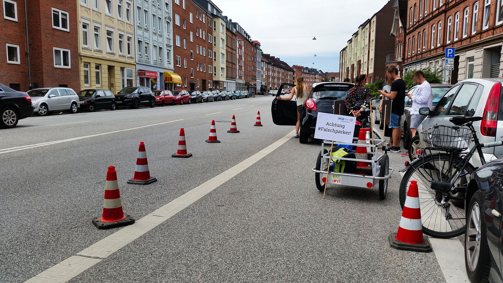Am Donnerstag dem 6. Juni haben VCD-Aktivisten auf das Problem des Falschparkens auf Radfahrstreifen aufmerksam gemacht. Dazu wurde mit Hilfe von Verkehrsleitkegeln der eigentliche Radfahrstreifen um das Hindernis herum gebaut. Parallel wurden die Gelben Karten des VCD verteilt. Die Reaktionen der Radfahrenden waren überwiegend positiv. Einige jedoch wechselten in trauriger Routine weit vor unserer "Ersatzspur" in den fließenden Verkehr. In einigen Fällen wurde das Ordnungsamt informiert, welches einen Falschparker abschleppen ließ.