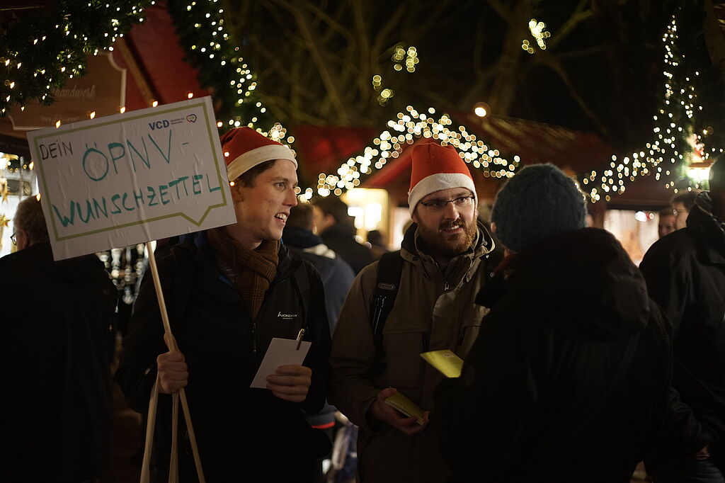 Kiel, 21.12.18 – Stadtbahn, freies WLAN, bessere Anbindung an das Umland und wettergeschützte Haltestellen. Zur Weihnachtszeit wünschen sich Kielerinnen und Kieler nicht nur Geschenke unter dem Weihnachtsbaum, sondern auch Verbesserungen des öffentlichen Personennahverkehrs. Bei der Aktion „ÖPNV-Wunschzettel“ der Kieler Ortsgruppe des Verkehrsclubs Deutschland (VCD) am 18. Dezember schrieben die Kielerinnen und Kieler ihre Wünsche zum ÖPNV der Landeshauptstadt an Oberbürgermeister Kämpfer und die Ratsfraktionen nieder. Alle waren sich einig: Der Kieler ÖPNV muss besser werden.