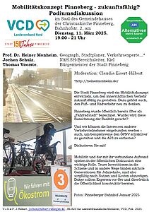 Am Dienstag, 11. März 2025 um 19 Uhr lädt die "Bürgerinitiative A23 für umwelftreundliche Mobilität" zusammen mit dem VCD Nord e.V. zur Podiumsdiskussion mit Prof. Dr. Heiner Monheim (Geograph, Stadtplaner & Verkehrsexperte) sowie Jochen Schulz (NAH.SH-Bereichsleiter, Kiel) und Thomas Voerste (Bürgermeister Stadt Pinneberg) in den Saal der Christuskirche Pinneberg ein.