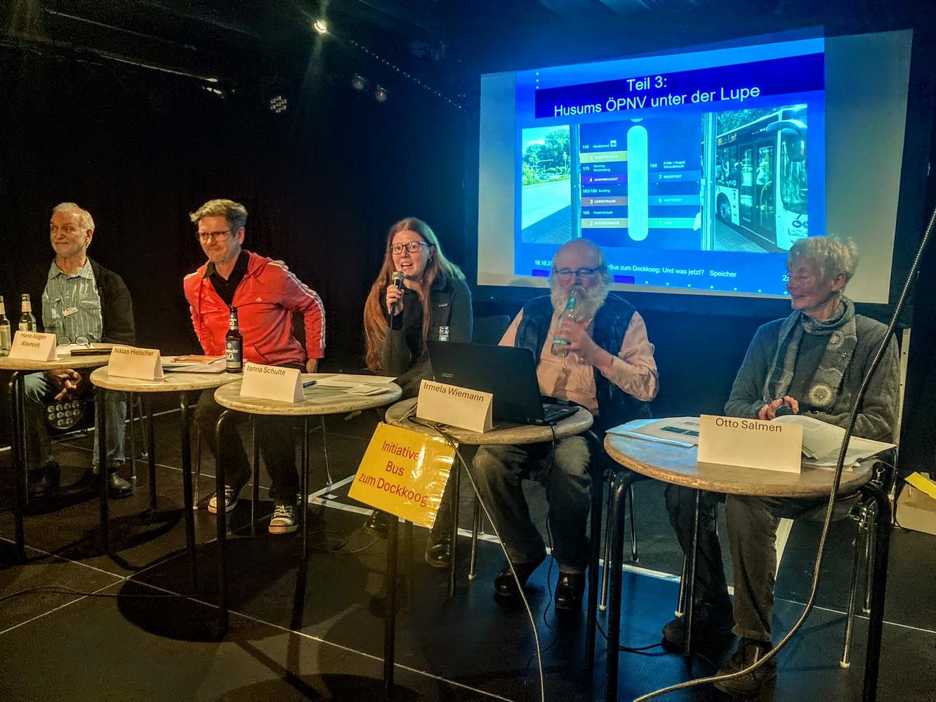 Nach der Pause nahm Otto Salmen Husums bestehenden ÖPNV unter die Lupe, besonderer Kritikpunkt: Das fehlende Mobilitätsangebot am Abend. Aus dem Publikum kam der Ruf: Dass Menschen am Abend keine Chance haben mit dem ÖPNV in die Stadt zu kommen, ist ein Skandal. 102 Unternehmen, Hotels, Geschäfte, Supermärkte, Kino, Institutionen etc. hatten einen offenen Brief an das Rathaus unterschrieben, der eine Verbesserung des ÖPNV in Husum wünscht, insbesondere eine Ausweitung des ÖPNV in den Abend hinein. Auch das Fehlen des touristischen ÖPNV zum Dockkoog wurde allgemein bemängelt.