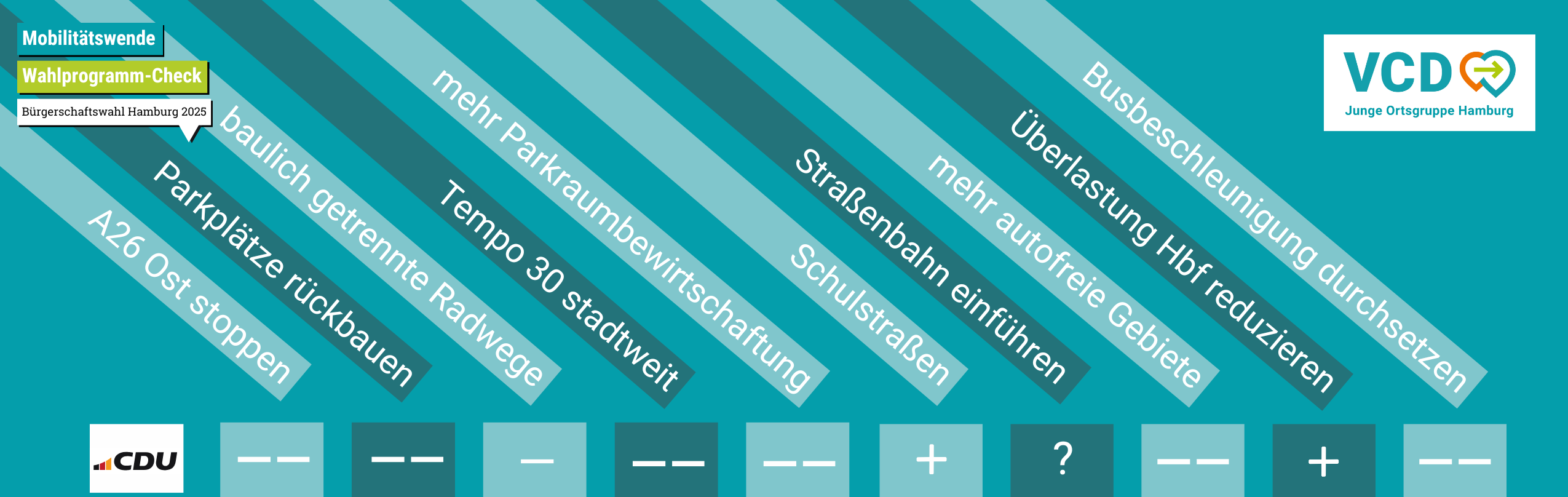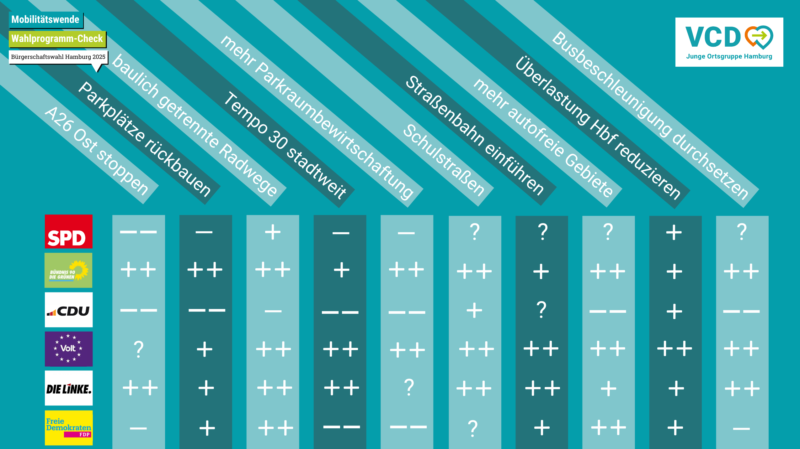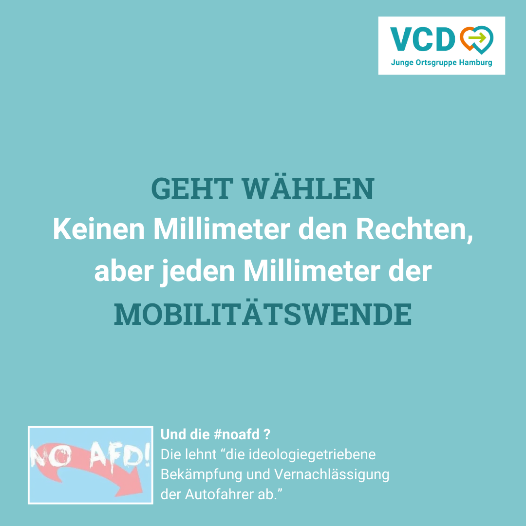 Am 02. März 2025 ist Bürgerschaftswahl. Wir, die Junge Ortsgruppe Hamburg, haben uns die Wahlprogramme der 6 größten demokratischen Parteien in Hamburg angesehen. Wer will wirklich Mobilitätswende?