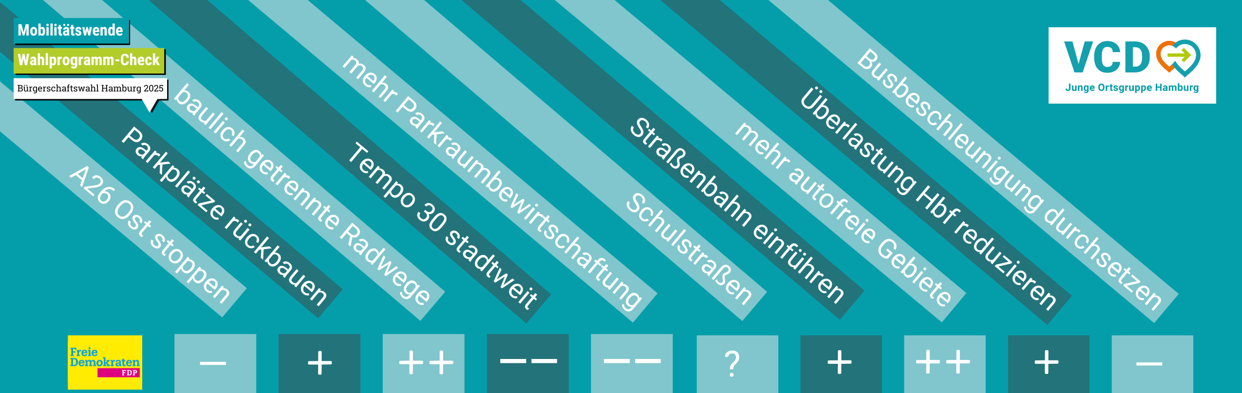 Die FDP hat wohl das ambivalenteste Wahlprogramm der Saison. Pluspunkte gibt‘s dafür, dass sie neue schienengebundene Querverbindungen und mehr autofreie Quartiere wollen. Aber ihre klare Ablehnung von Tempo 30? Von mehr Parkraumbewirtschaftung? Und ihre Zustimmung zum Autobahn-Ausbau? Schade, Chance vertan, vielleicht gäb‘s dann ja mal wieder eine*n Abgeordnete*n in der Bürgerschaft. Hier gibt‘s das FDP-Wahlprogramm in voller Länge
