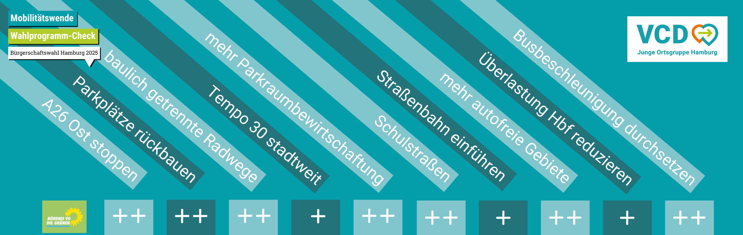 Wer will wirklich Mobilitätswende? Dafür haben wir 10 Themen festgelegt, die aus unserer Sicht als Junge Ortsgruppe des VCD Nord e.V. wichtig sind – aber es ist natürlich klar, dass es noch viel mehr wichtige Mobilitätsthemen gibt (u.a. Fußverkehr, Barrierefreiheit, Radverkehrsausbau, Schnellbahnausbau, Dezentralisierung des Hauptbahnhofs, Ertüchtigung des Schienenknoten Hamburg allgemein, ...).