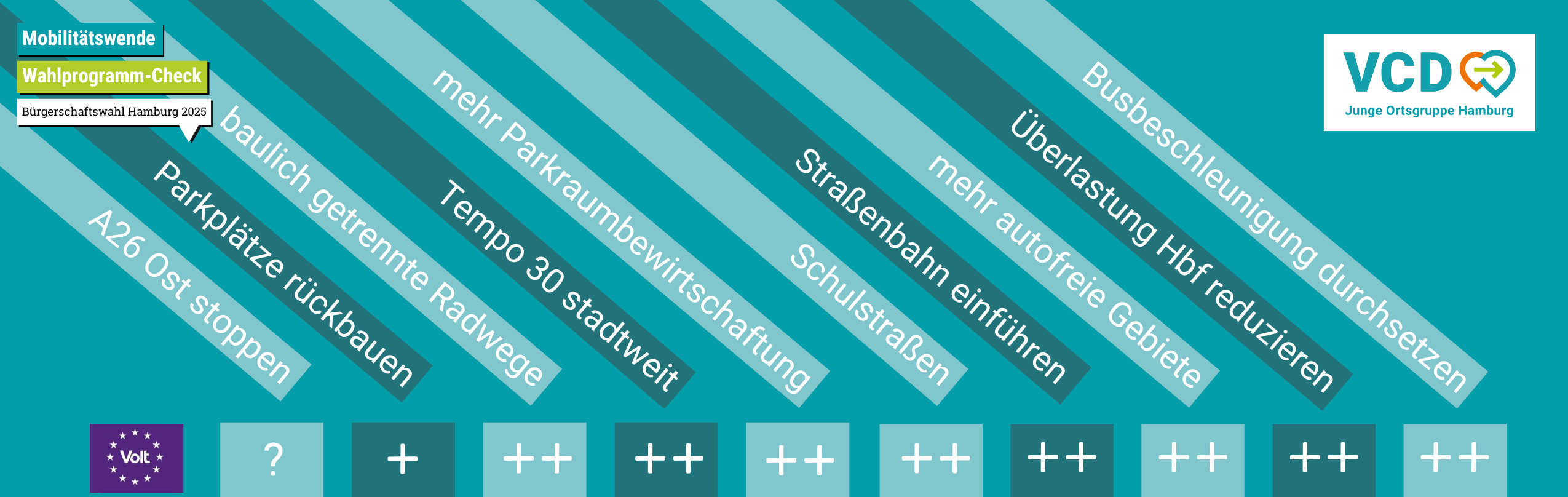 Volt haben ihr zweites Bürgerschaftswahlprogramm geschrieben und haben sich satte 21 Seiten Verkehr gegönnt. Dabei machen sie einen Ritt durch das Einmaleins der Mobilitätswende und haben sich ein Fleißbienchen verdient. Unser unerfüllter Wunsch: ne Position zum Neu- und Ausbau von Autobahnen. Angesicht des restlichen Programms kann man glücklicherweise davon ausgehen, dass sie A26 Ost & Co. ablehnen. Hier gibt‘s das Volt-Wahlprogramm in voller Länge