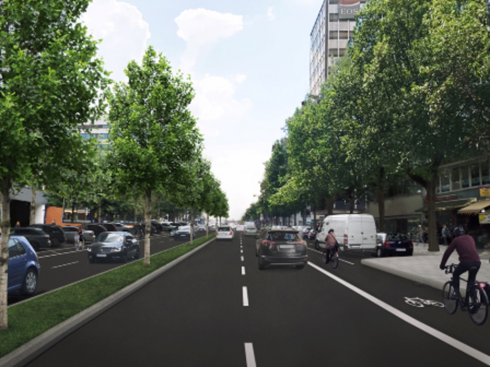 Viel Platz für Autos, statt Verkehrsführung mit Zukunft. Die Veloroute 7 am Abschnitt Steindamm mit neuer Mittelbaumreihe ab 2021: Der Autoverkehr bleibt vierspurig, der Radverkehr schmal am Rand.