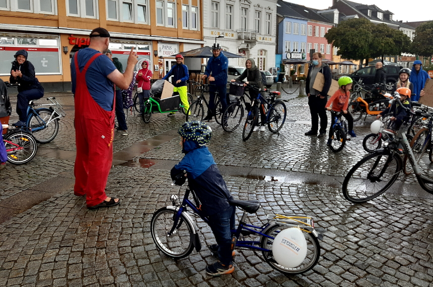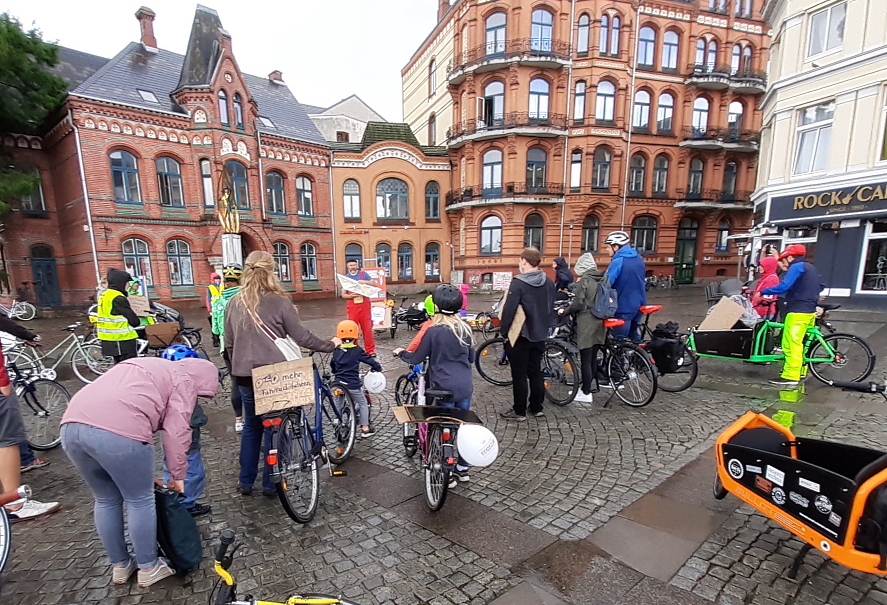 Klingelnd radelten die Teilnehmenden weiter. Nach einem Halt bei der Nikolaistraße kam der Demonstrationszug am Südermarkt an. Dort begrüßte Dr. Volker Willandsen die inzwischen recht nassen Kinder und Erwachsenen.