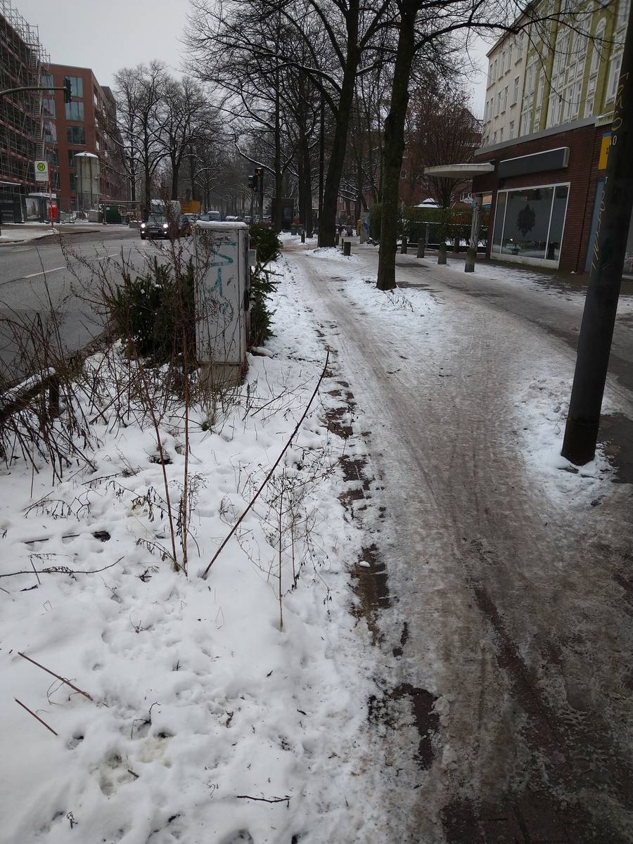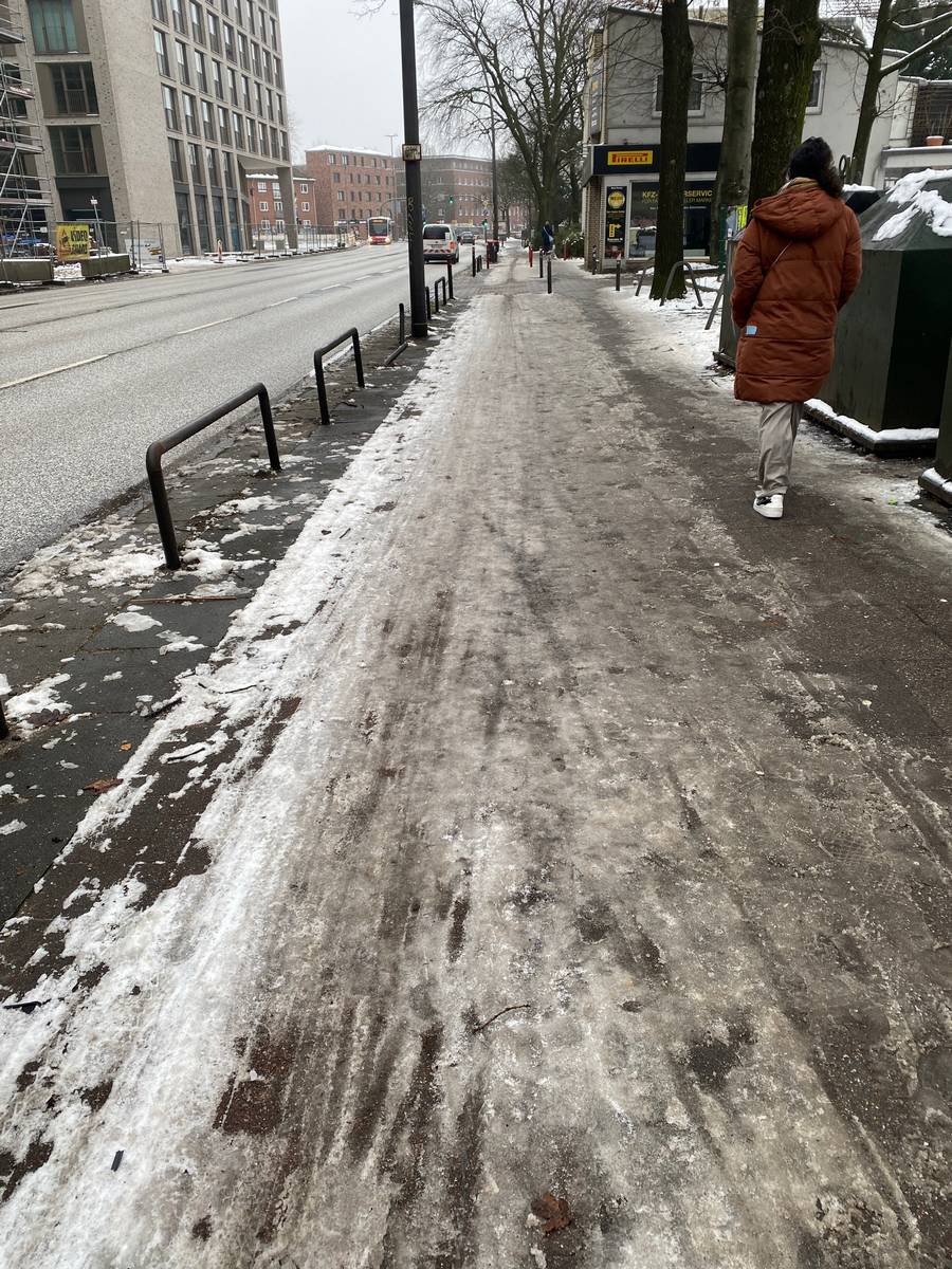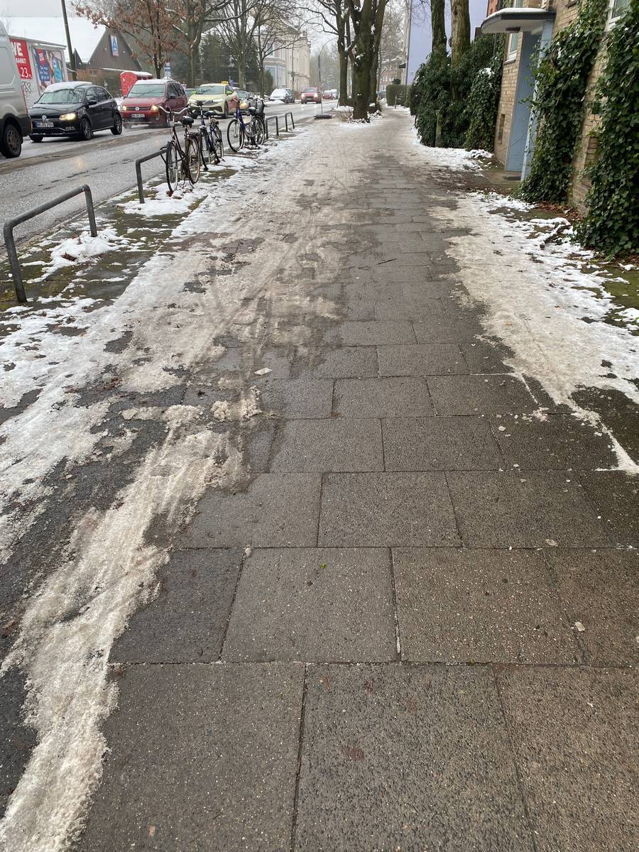 Ein Grund liegt am Hamburger Wegegesetz. Es verbietet den Einsatz von Taumitteln auf Geh- und Radwegen. Die Stadtreinigung darf nur Kies streuen, der schnell wieder überfriert. Und das im Unterschied zum Einsatz von Salz und Sole auf den Fahrbahnen, wie der Sprecher der Hamburger Stadtreinigung jüngst der Hamburger Morgenpost mitteilte. Nebenstraßen würden demnach gar nicht geräumt.
