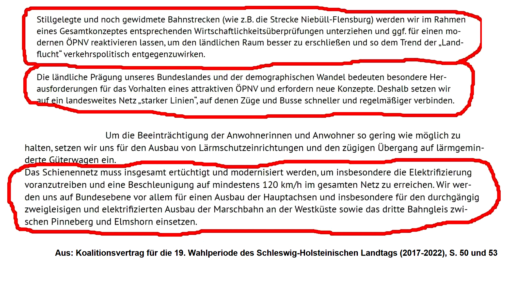Sie wies hin auf den Koalitionsvertrag 2017-2022 von CDU, Grünen und FDP. Als Ziele sind darin vereinbart, die Wirtschaftlichkeit von Bahnstrecken zu prüfen, sie ggf. zu reaktivieren und die Marschbahn zu ertüchtigen.